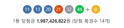 당첨 번호는 11, 13, 20, 21, 32, 44 보너스번호 8번